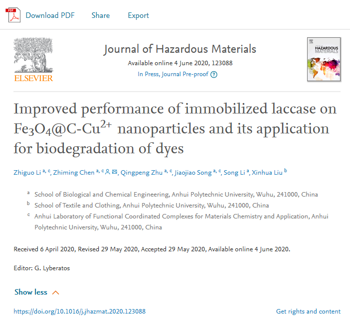 第一版主 化学学科纳米生物催化作用团队经过长期攻关,最近在固定化酶研究领域取得重要进展,相关成果以“Improved performance of immobilized laccase on Fe3O4@C-Cu2+ nanoparticles and its application for biodegradation of dyes”为题在爱思唯尔(Elsevier)旗下期刊Journal of Hazardous Materials (IF:7.650,中科院一区)上在线发表(//doi.org/10.1016/j.jhazmat.2020.123088)。该论文第一作者为第一版主 化学专业2018级硕士研究生李志国,通讯作者为第一版主 陈志明教授。
