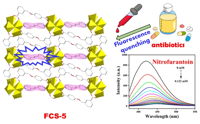 该论文通过辅助配体调控机制制备了两种锌(II)基金属有机框架材料FCS-4FCS-5,并将其用作硝基呋喃类抗生素的超灵敏检测。研究发现,吡啶基辅助配体的不同柔韧特性可导致不同的拓扑结构和荧光性能。在抗生素的超灵敏检测中,FCS-5对呋喃西林和呋喃妥因的检测灵敏度更高,其检测限分别可达0.220.15 ppm。进一步的机理研究表明,光诱导电子转移在硝基呋喃类抗生素的超灵敏检测中起关键作用。该项工作为新型金属有机框架材料基化学传感器的设计与构建提供了新的思路。