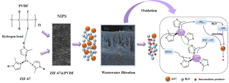 近年来,该团队重点从事膜分离技术及其在环境污染治理中的应用研究。该工作中,团队通过将ZIF-67纳米粒子掺杂进入聚偏氟乙烯(PVDF)铸膜液中,通过非溶剂诱导相转化工艺,制备出高性能的混合基质超滤膜(ZIF-67@PVDF)。利用膜上的ZIF-67对过硫酸氢钾复合盐(PMS)的活化作用产生硫酸根自由基,从而极大的提高PVDF超滤膜的抗污染能力,以此减少化学清洗过程对于膜的损伤,显著降低了膜技术成本。此外,为了探究该膜对各种染料的适用性,在PMS在线清洗模式下,该膜对亚甲基蓝、罗丹明B等染料溶液处理分别具有98.2%和90.5%的截留效果,表明所制备出的ZIF-67@PVDF混合基质膜具有很好的染料废水处理能力。