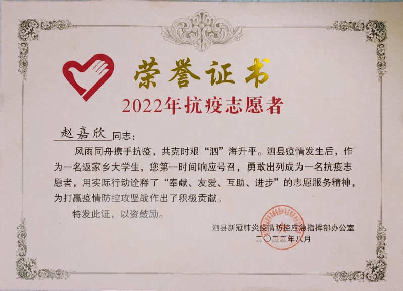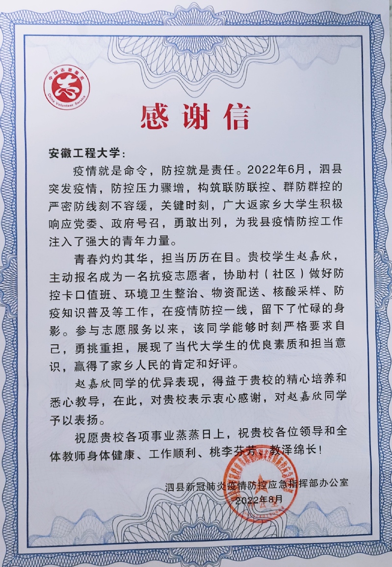 信中指出,2022年6月,泗县突发疫情,赵嘉欣积极响应党委、政府号召,勇敢出列,主动报名成为一名抗疫志愿者,该同学能够时刻严格要求自己,展现了当代大学生的优良素质和担当意识,赢得了家乡人民的肯定和好评。赵嘉欣同学的优异表现,得益于贵校的精心培养和悉心教导,祝愿贵校各项事业蒸蒸日上,祝贵校各位领导和全体教师身体健康、工作顺利、桃李芬芳学教泽绵长!