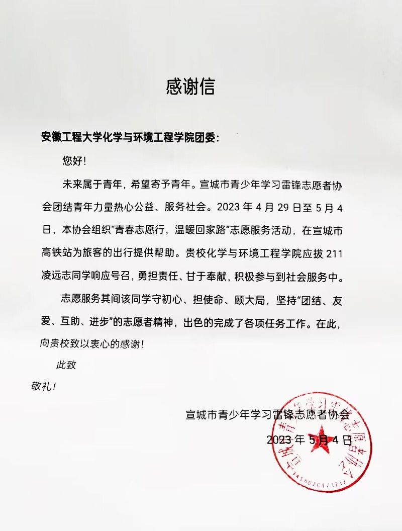 近日,宣城市青少年学习雷锋志愿者协会向第一版主 团委发来感谢信,感谢第一版主 应用化学(拔尖)211班的凌远志同学利用五一假期时间,积极投身志愿服务,参与宣城市“青春志愿行,温暖出行路”志愿服务活动过程中的出色表现。