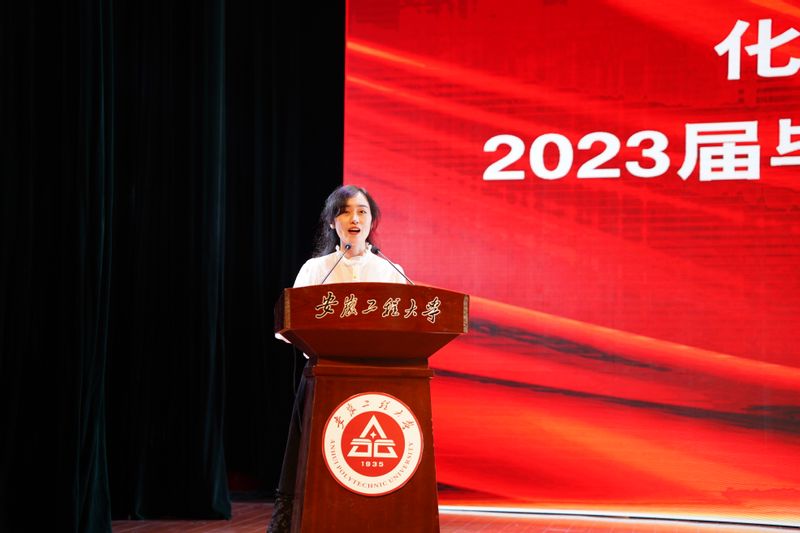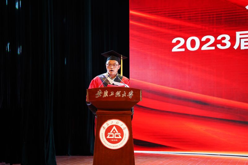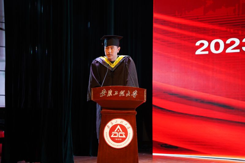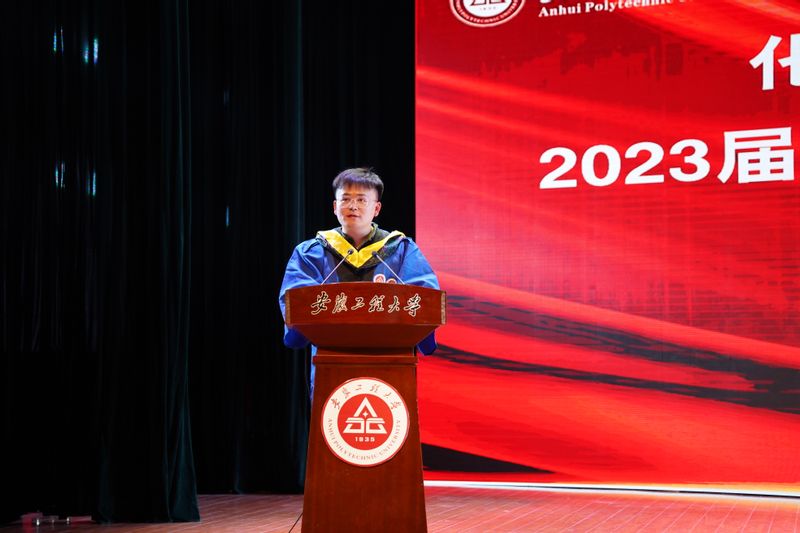 本科生学生代表丁宇杰发言,他诉说了对母校的赞美、对师友的感恩和自己不负青春时光的成长故事,将牢记学院领导老师的殷殷期盼和深深嘱托,胸怀大志、脚踏实地,负有责任、勇于担当,不畏艰险、追求卓越,彰显出徽程学子的智慧与拼搏。