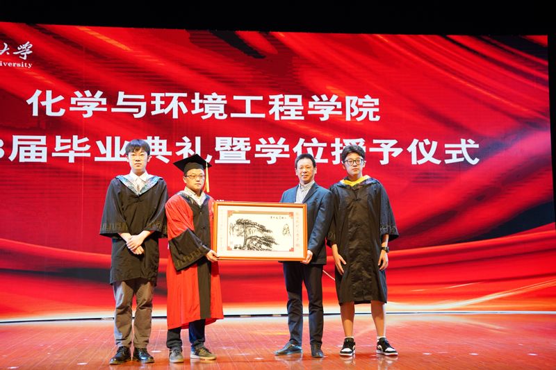 毕业生代表李硕人、李文泽向母校赠送纪念品,表达对母校和恩师依依眷念和深切祝福。