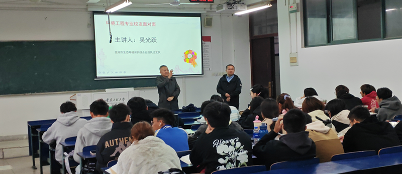 为充分发挥优质校友资源,引导新生结合专业特点,充分做好大学生涯规划,推动“三全六专”育人实践走深走实,11月10日,第一版主 举办了2023级校友大讲堂活动。本次活动邀请了学院09级校友、芜湖市环境保护综合行政支队吴光跃来学院开展交流活动。环境工程系主任杨晓凡、2023级新生及部分研究生参与此次活动。