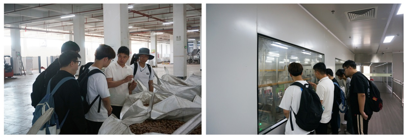 三只松鼠安徽无为产业园位于无为县高新技术产业开发区,基地内部布局合理,生产流程清晰,从原料入库到成品出库都严格遵循食品安全标准和质量控制体系;公司采用先进的供应链管理系统,实现了对原材料采购、生产过程、物流配送等环节的精细化控制。园区质量经理张文凯带领师生一行人参观了夏威夷果的生产过程,了解了筛选、开口、入味、高温杀菌等流程。生企双方就项目团队较为关注的企业生产流程和质量控制体系、生产技术和工艺创新、供应链管理模式、在可持续发展和环保方面的举措等问题展开深度交流。