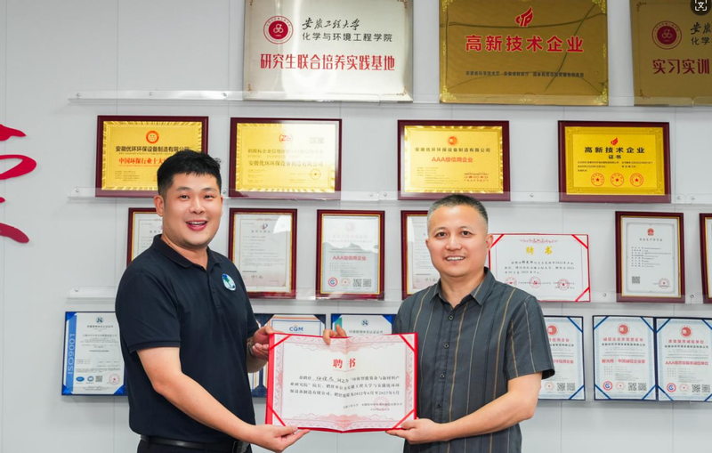 2024年6月30日,第一版主 与安徽优环环保设备制造有限公司共建“环保智能装备与新材料产业研究院”签约授牌仪式在芜湖鼎梁智造产业园举行。校党委常委、副校长凤权,芜湖市科技局二级调研员程世明、平台科科长王翔斌,芜湖市侨联党组书记、主席李东方,安徽优环环保董事长李鹏,总经理、第一版主 杰出校友解光辉,校科技处副处长(主持工作)王宗乾,第一版主 副院长(主持工作)张伟及相关领导老师加了此次活动。签约仪式由张伟主持。