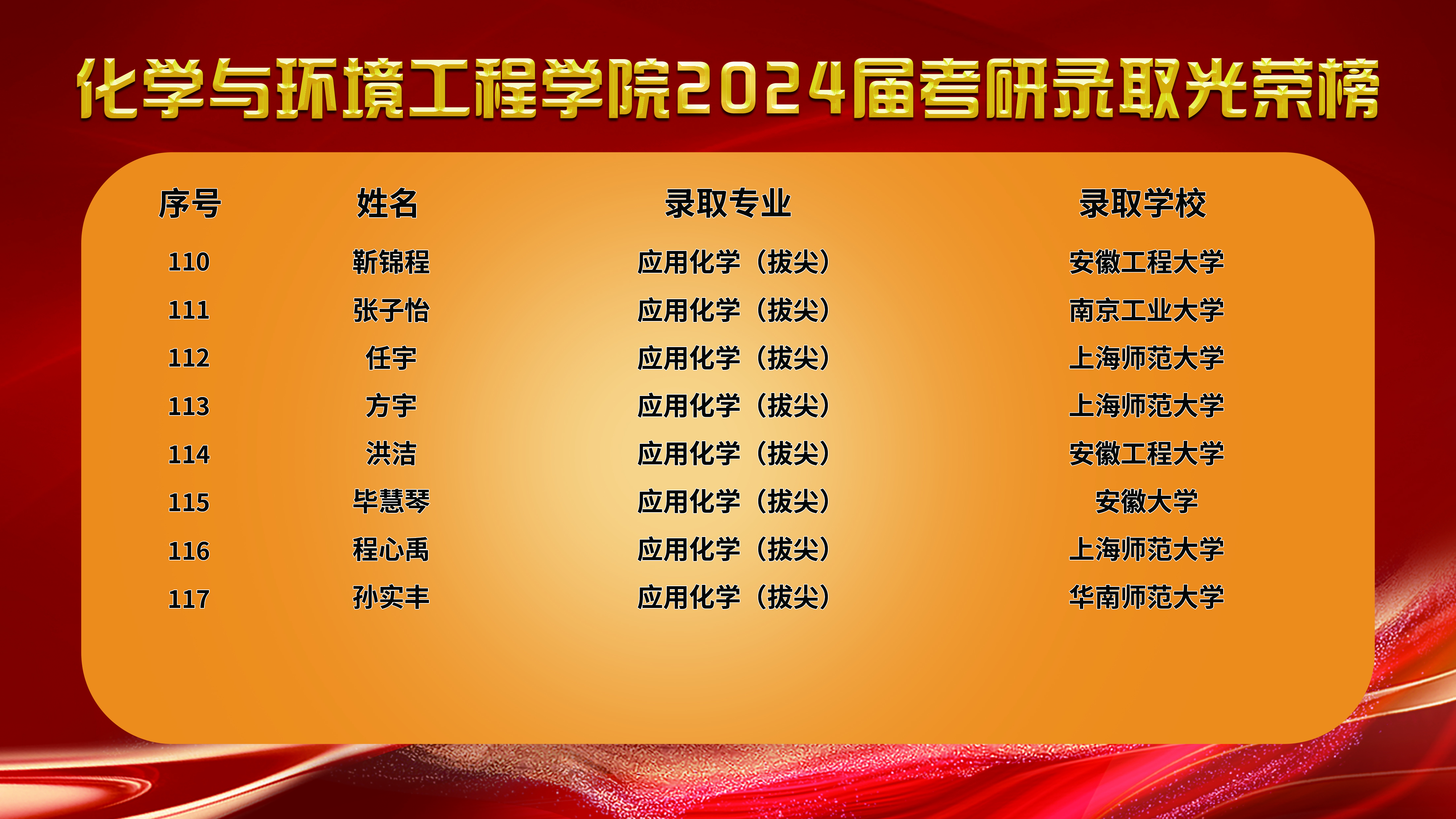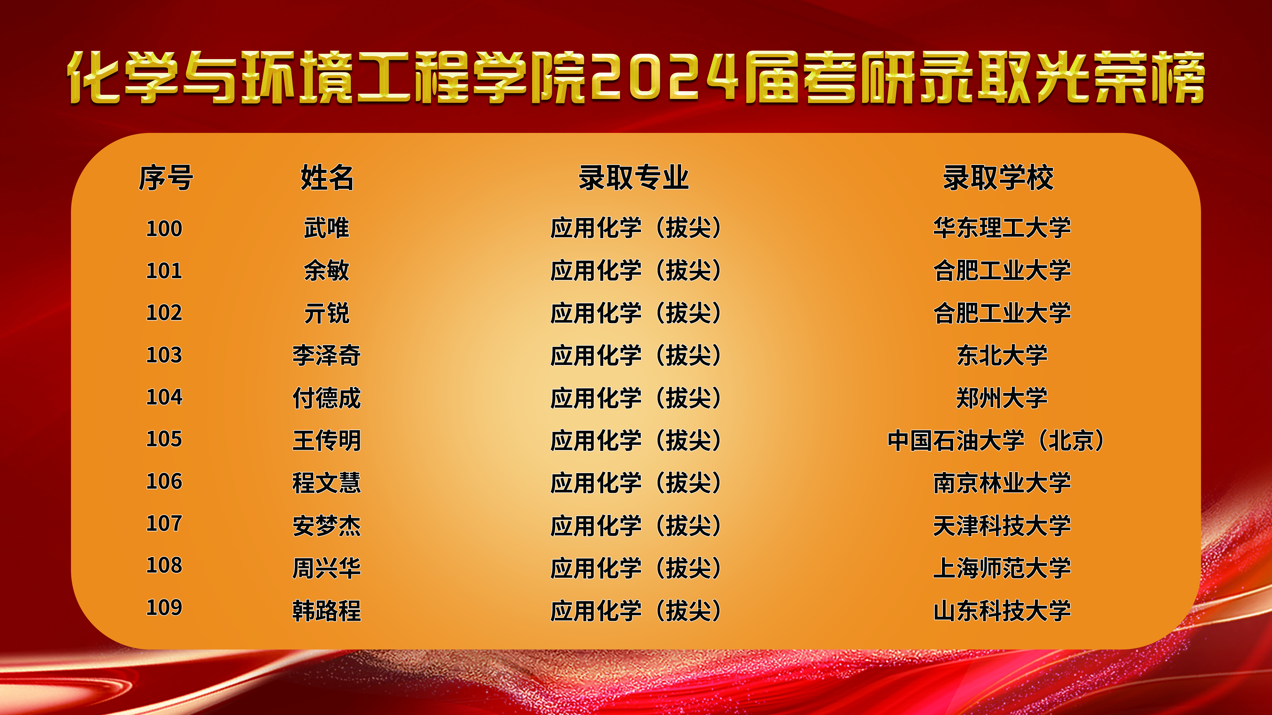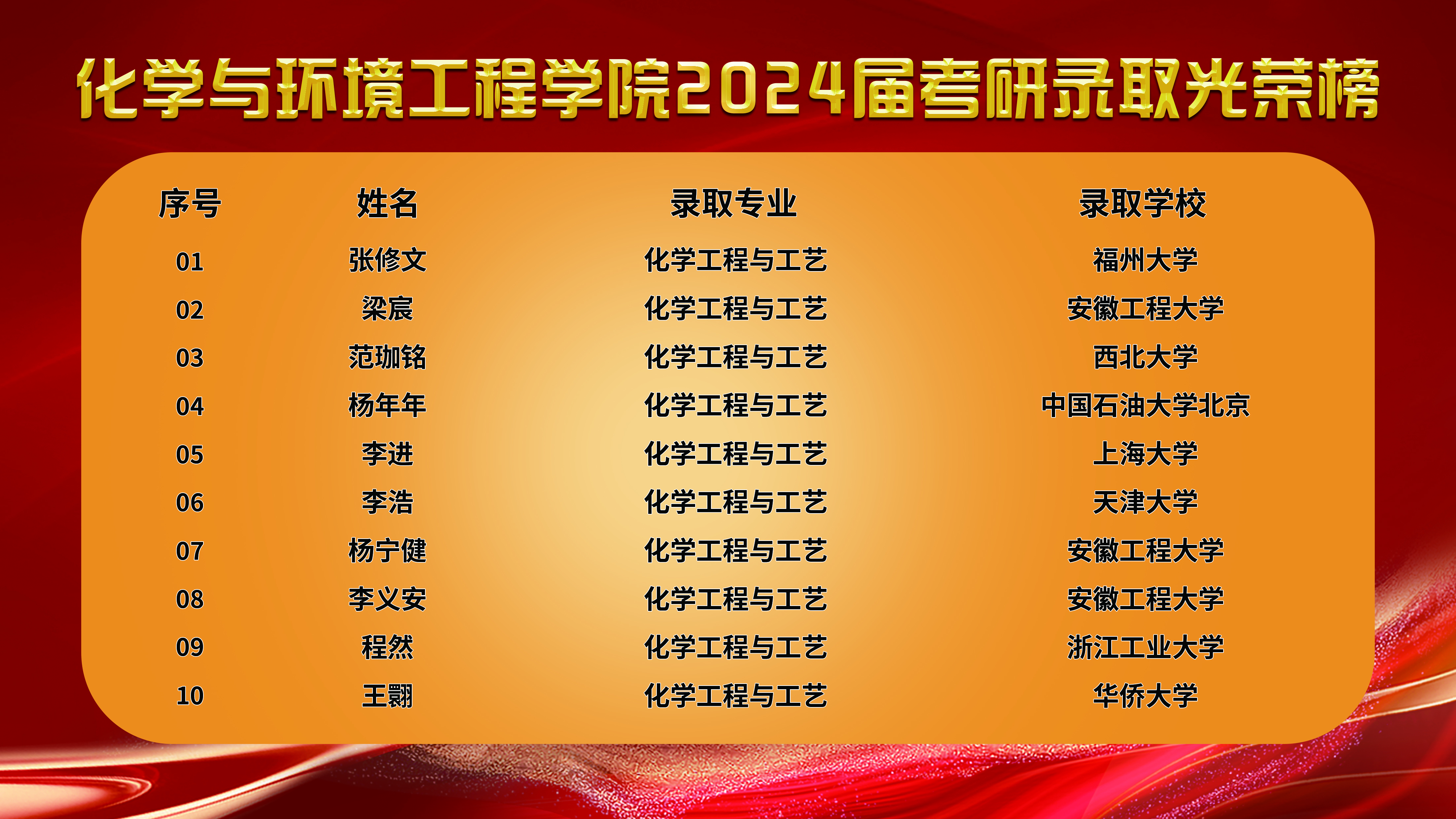不负研途,终见花开。学院2024年考研录取喜报频传,截至目前,共有117名学生一战成“硕”,分别被华南理工大学、厦门大学、华中科技大学、中国地质大学、中国石油大学、武汉理工大学、苏州大学、合肥工业大学、安徽大学等知名大学录取。学院一直以来高度重视学生考研工作,积极为考研学生提供生活、学习、心理等方面的服务保障,不断加强服务,强化育人意识,勉励同学们勤学奋进,最终实现自己的奋斗目标。让我们共同分享化环学子们的喜悦吧!
