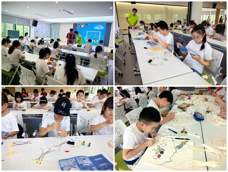 培养少年儿童的动手能力是科学教育的重要一环。为了提升对所学知识的应用,实践团队为小营员们准备了多种多样的创意手工:如在交通安全教育课程后,安排了模拟红绿灯制作;在太空科技普及课程后,安排了“漫游太空”主题绘画。在团队志愿者讲解引导下,由小营员们动手制作。当看到自己亲手制作的红绿灯“亮起来”,亲手绘制的太空火箭“飞起来”,小营员们心中埋下了一颗科学创造的种子,在往后的学习生活中能够运用夏令营期间培养的动手能力解决实际问题。