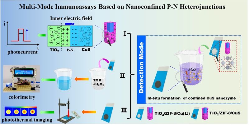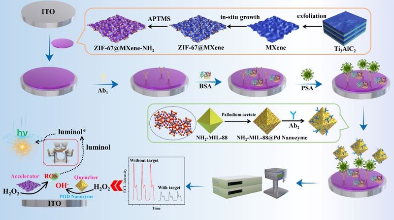 探索新型电化学发光(ECL)共反应加速剂,构建超灵敏传感检测体系是开发先进ECL传感器的重点研究内容。然而,高效共反应加速剂的设计及增强机制方面的研究仍面临巨大挑战。本文设计开发了一种ZIF-67@MXene纳米片复合材料,其良好的平面导电性和限域微孔道结构使其在鲁米诺-H2O2基ECL体系中实现了显著的电化学发光增强。机理研究表明,由于羟基自由基(·OH)和单重态氧(1O2)在ZIF-67@MXene纳米片上的吸附能较低,在ZIF-67@MXene上可选择性优先生成·OH和1O2,从而使鲁米诺的ECL效率提高830%。通过设计一种新型NH2-MIL-88@Pd纳米酶,该团队构建了一种“on-off”免疫生物传感器,实现了对前列腺特异性抗原的超灵敏检测,其线性检测范围扩大了3个数量级。检出限由1.44 × 10−11提高到9.1 × 10−13 g·mL−1。本研究为肿瘤标志物的超灵敏检测提供了一种新的策略。