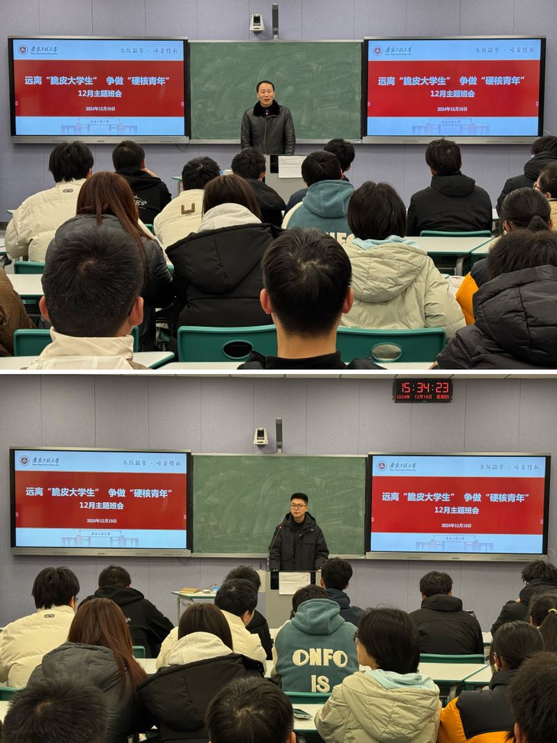 在高分子242班主题班会上,王康老师以“远离‘脆皮大学生’,争做‘硬核青年’”为主题,通过深入剖析“脆皮大学生”现象、“脆皮大学生”应对策略、如何争做“硬核青年”,展现青年的担当与责任三部分开展,循循善诱,结合身边案例、日常管理等为学生们开展了深入地讲解。学生们在讨论和交流表示深刻认识到“脆皮大学生”现象的严重性和危害性,并要积极行动起来,从自身做起,努力成为真正的“硬核”青年大学生。