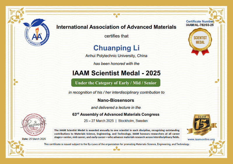 IAAM是材料领域著名的非营利性国际学术组织,总部位于瑞典。该组织聚集了世界范围内材料科学与技术领域最优秀的科学家,拥有来自139个国家的83000多名会员。该组织根据研究人员近十年在先进材料基础和前沿应用领域所作的工作,经专家提名、学术委员会评审、学术演讲等环节,在世界范围内评选和授予作出重要贡献的研究人员。IAAM科学家奖章授予取得高质量研究成果或表现出突出潜力的科学家,以表彰他们的辛勤工作,亦希望激发研究人员从事长期研究工作,推动世界材料科学的发展。2025“先进材料大会”325-27日在瑞典斯德哥尔摩召开,李传平博士应邀作了题为Construction and Nano-Engineering of Multimode Photoelectrochemical Biosensors for Accurate Point-of-Care Testing的大会主题演讲。