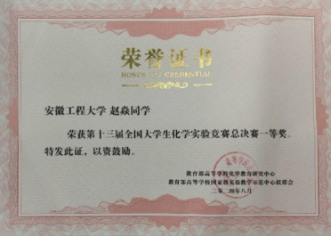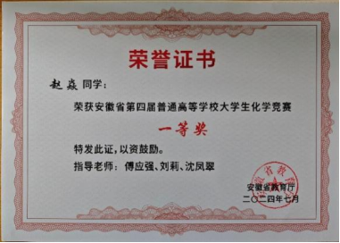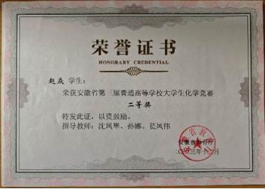 在项目研究过程中,团队取得丰硕成果:发表高水平国际论文1篇,项目组成员赵焱先后斩获第十三届全国大学生化学实验竞赛总决赛一等奖(有机赛道全国第7名)、第四届全国大学生高分子材料实验实践大赛三等奖第一名、第四届安徽省普通高等学校大学生化学竞赛一等奖、第三届安徽省普通高等学校大学生化学实验竞赛二等奖、鑫龙奖学金、长信科技奖学金等荣誉。