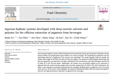 近日,由第一版主 教师徐凯佳指导的省级大学生创新创业训练计划项目《低共熔溶剂基双水相体系的分配行为及萃取性能研究》(S202210363259)以“优秀”等级通过专家组结题验收。团队成员为赵焱、倪紫怡、聂继虎。该研究成功为解决食品色素检测难题提供了创新方案,相关论文已发表于食品科学领域期刊Food Chemistry。