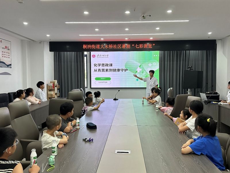 为提升青少年爱国情怀,培养家国意识,2025年7月9日,第一版主 “童享化学,七彩领航”乡村振兴实践营暨暑期“三下乡”项目第三日的活动在桐汭街道大木桥社区党群服务中心温情开讲。当天,一场以“化学与医药大思政课”为主题的特色课程,将科学知识与家国情怀巧妙融合,为参与活动的孩子们带来了一堂妙趣横生的成长课。