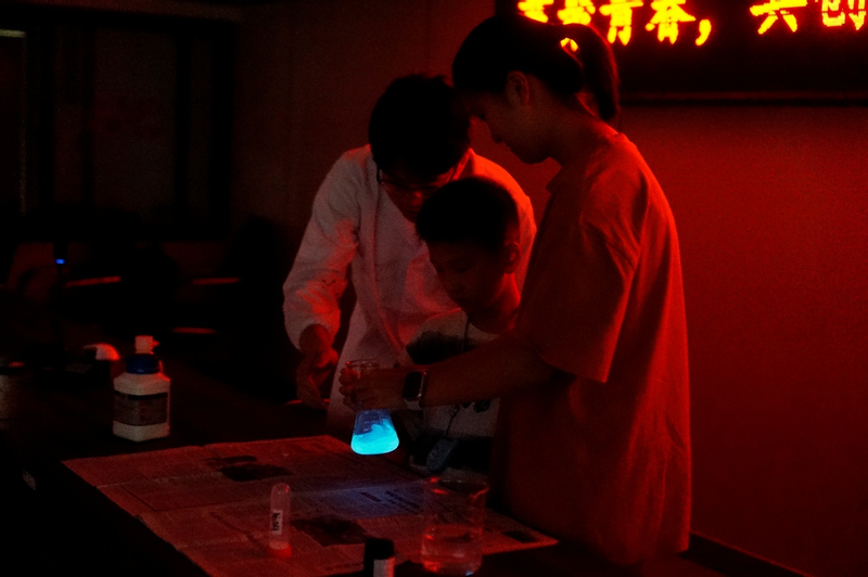 “魔法荧光棒”实验中,孩子们摇晃混合好的鲁米诺试液后,透明液体瞬间发出蓝色荧光,持续1分多钟才变暗。“这和警察查案用的技术有点像,能让看不见的痕迹发光。”主持人简单的延伸讲解,让孩子们眼中的好奇更浓了。
