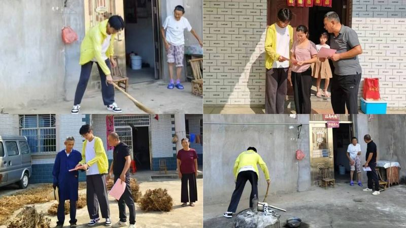 在讲解完有关安全知识的问题后,实践学生得知社区老人家中无子女帮忙整理家务,便主动请缨帮忙打扫外院,充分展现了对老人的关怀。
