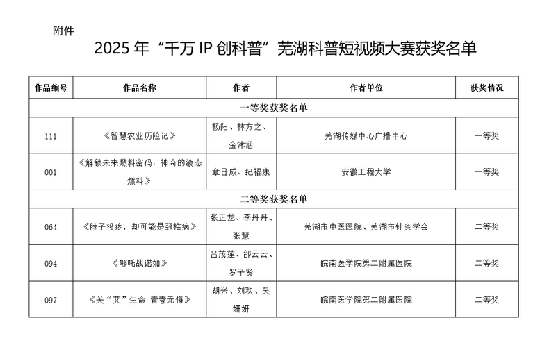 “千万IP创科普”芜湖科普短视频大赛是落实全省前沿科技科普行动计划的重要赛事,旨在展现区域科学创新能力及社会发展水平,普及科学技术知识,全面提升公民科学素质,助力省域副中心城市建设。本届赛事吸引了来自芜湖各学校、机构及社会科普爱好者组成的多支队伍参与,经过初评、网络投票、终评等多轮严格考验,最终仅有2支队伍荣获一等奖,竞争尤为激烈。