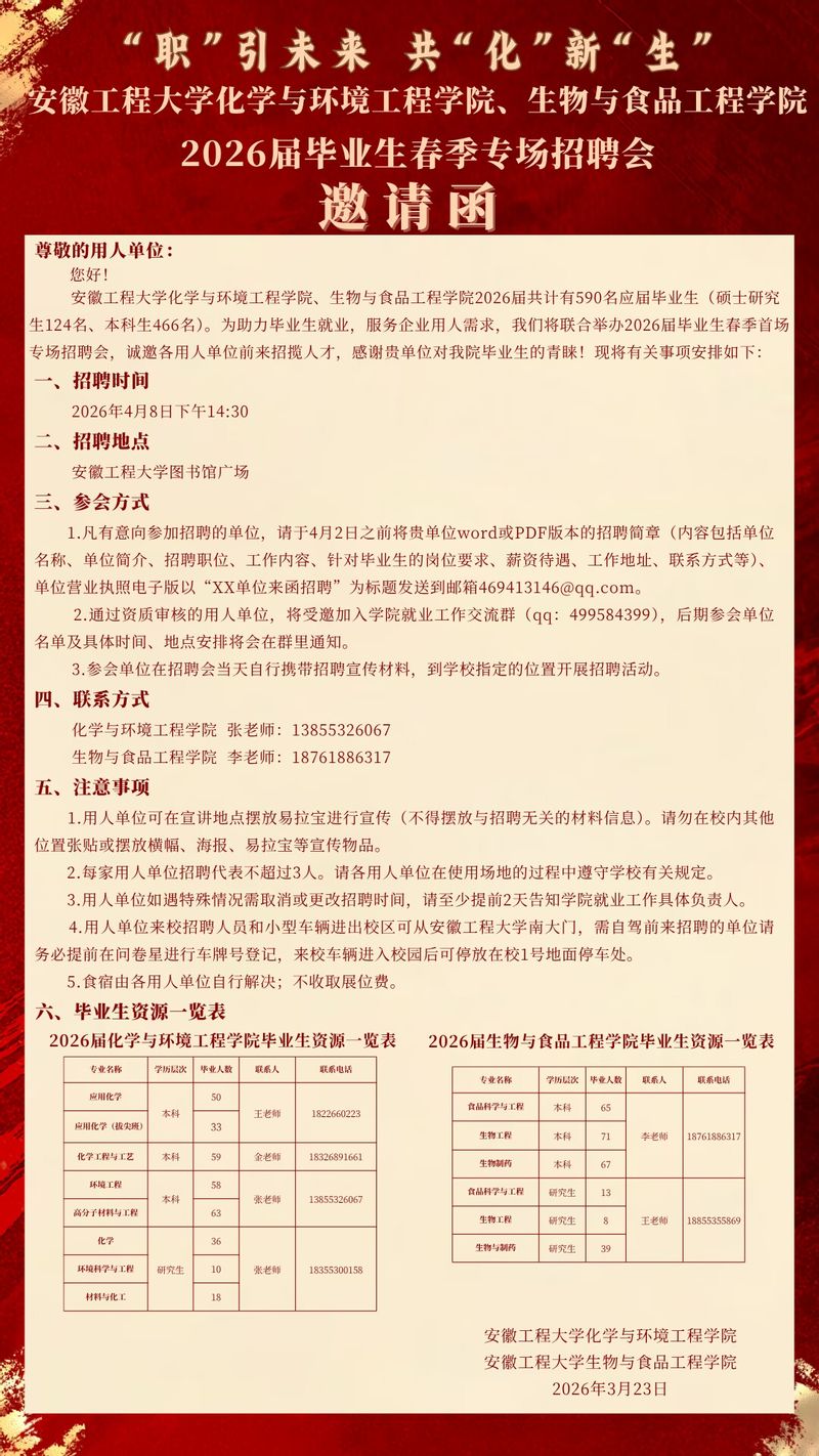 “职”引未来 共“化”新“生”——第一版主 、生物与食品工程学院2026届毕业生春季专场招聘会邀请函